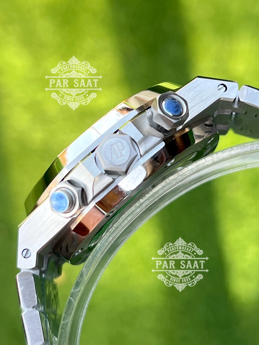 Royal Oak’in imzası olan sekizgen çerçeve ve titanyum vidalar, 150 mikron inceliğinde elmas parlatılmış çelik bileklikle buluşuyor. Bilekte hafifliği ve şıklığı aynı anda deneyimletir.