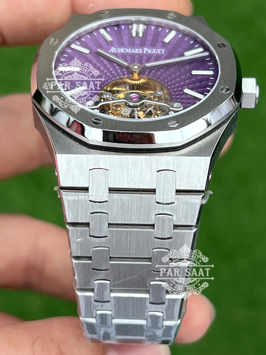 Lüks saatçiliğin zirvesindeki bu eşsiz parça, ikonik Royal Oak tasarımını, nadir mor kadranı ve süzülür gibi duran uçan turbolyonu ile bir araya getiriyor. Bir koleksiyonerin hayalini süsleyen bu saat, en ince detaylarına kadar olağanüstü bir işçilikle üretilmiştir.