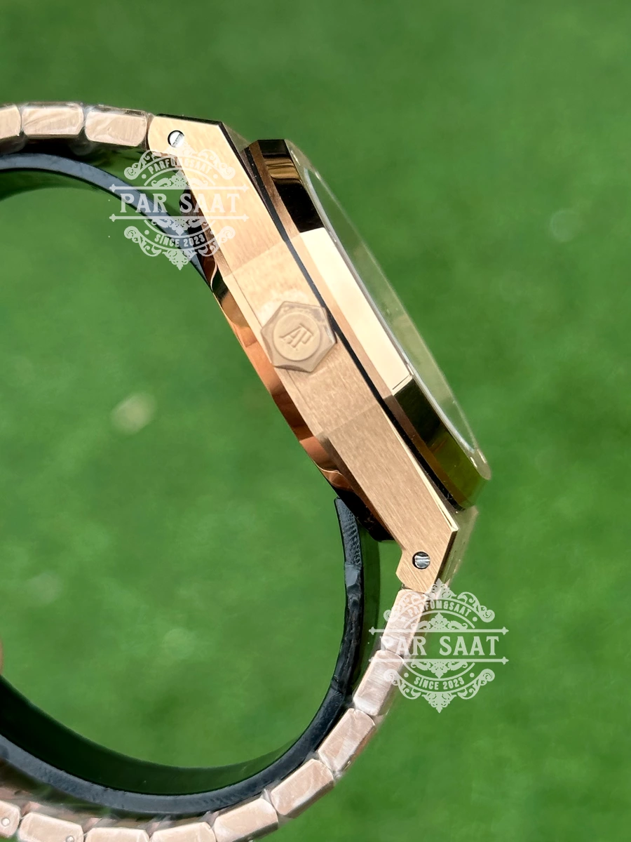 Audemars Piguet’nin efsanevi Royal Oak koleksiyonunun göz kamaştıran bir mücevheri olan 26533OR, zarafet ve teknik mükemmelliği bir araya getiriyor. 18 ayar pembe altın kasa, ikonik sekizgen çerçeve ve titanyum vidalarla çerçevelenmiş, Royal Oak’in cesur tasarım dilini öne çıkarıyor. Yemyeşil “Grande Tapisserie” desenli lacivert veya gökkuşağı tonlarında parlayan kadran, merkezinde hipnotik bir dans sergileyen tourbillon komplikasyonu ile taçlanıyor. Bu mekanik şiir, sadece zamanın akışını dengelemekle kalmıyor, aynı zamanda sanatsal bir gösteri sunuyor.