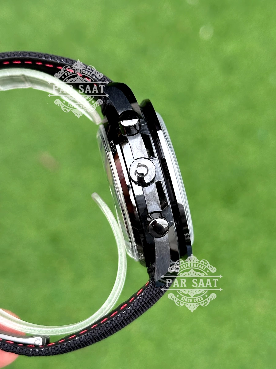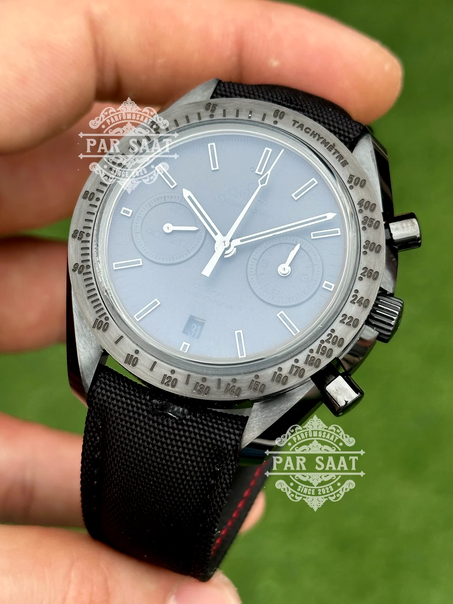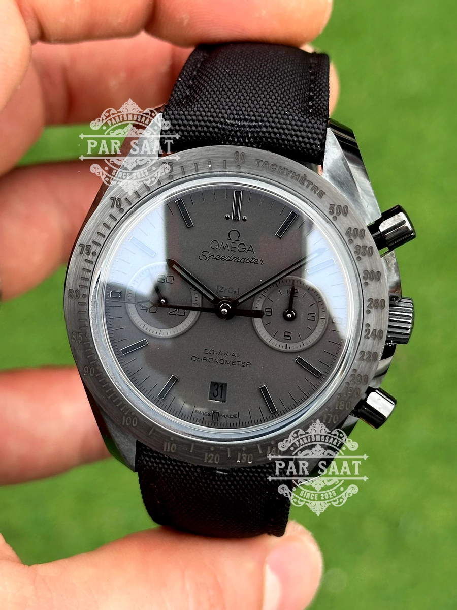 Zamana meydan okuyan bu Speedmaster, tamamen siyah bir estetikle uzay ve pistin ruhunu birleştiriyor! 44.25 mm çelik kasa, siyah seramik bezel ve kadran üzerinde siyah tachymetre ölçeği, hız hesaplamanın minimalist zarafetini yansıtıyor. “Speedmaster” ve “Co-Axial Chronometer” yazıları, kadrana teknik bir kimlik kazandırırken, Kalibre 9300 arka planda sessizce devrim yaratıyor.