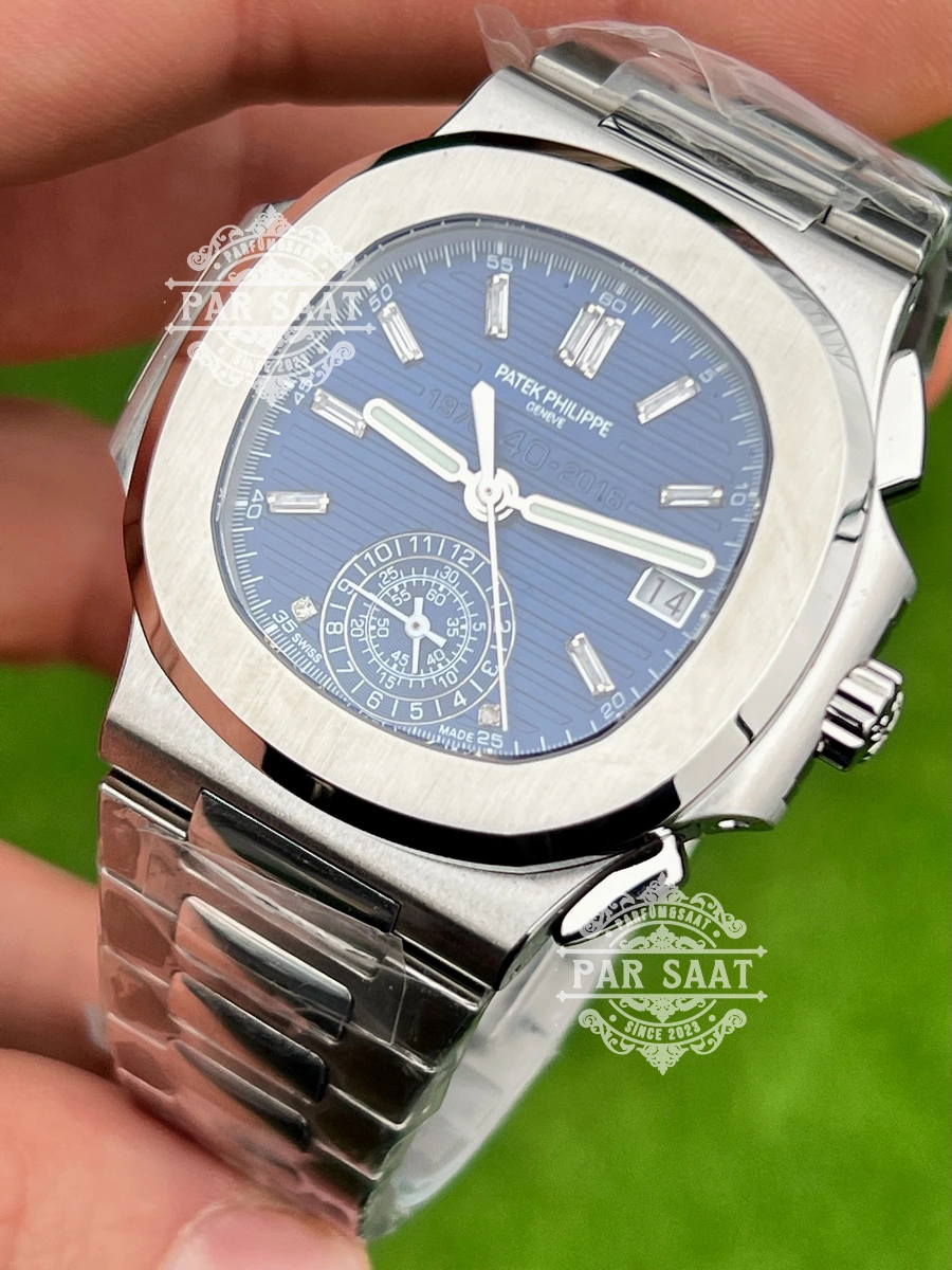 Patek Philippe 5976 40. Yıl modeli, Nautilus serisinin 40. yılını kutlamak amacıyla tasarlanmış, zarif ve modern bir başyapıttır. 40mm paslanmaz çelik kasa, şık fırçalanmış ve parlatılmış yüzeyleriyle göz alıcıdır. Kadrandaki “Hauyé” dalgalı desen, ışıkla değişen bir doku sunar. Altın renkli indeksler ve tarih-kronograf göstergeleri, fonksiyonellik ile şıklığı birleştirir.