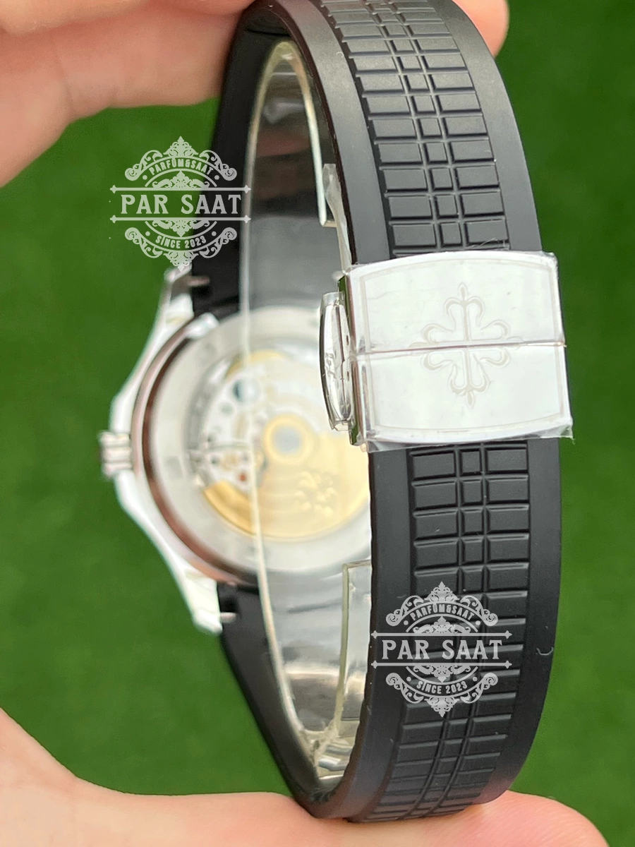 Patek Philippe 5167’nin kauçuk kayışı, saatin sportif tarzını vurgularken, bilekte rahat ve konforlu bir kullanım sağlar. Dayanıklı ve esnek yapısı, saatin her durumda mükemmel bir uyum sağlamasına olanak tanır.