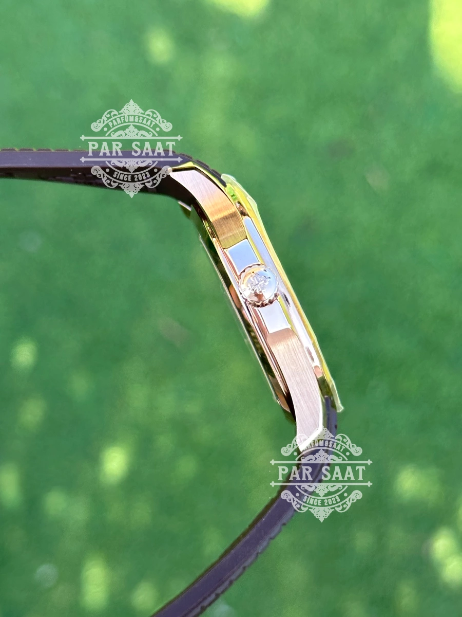 Patek Philippe 5167, Nautilus koleksiyonunun zarif ve sportif bir parçasıdır. 40 mm paslanmaz çelik kasa, Patek Philippe’in ünlü tasarımını zarif bir şekilde sunar. Fırçalanmış ve parlatılmış yüzeylerin mükemmel geçişleri, saatin hem şıklığını hem de dayanıklılığını simgeler. Kadrandaki sunburst tonları, ışıkla değişen canlı bir efekt yaratır ve saatin her açıdan farklı bir güzellik ortaya koymasına olanak tanır. Altın renkli indeksler, okuma kolaylığını artırırken, estetik açıdan saatin zarifliğini pekiştirir.