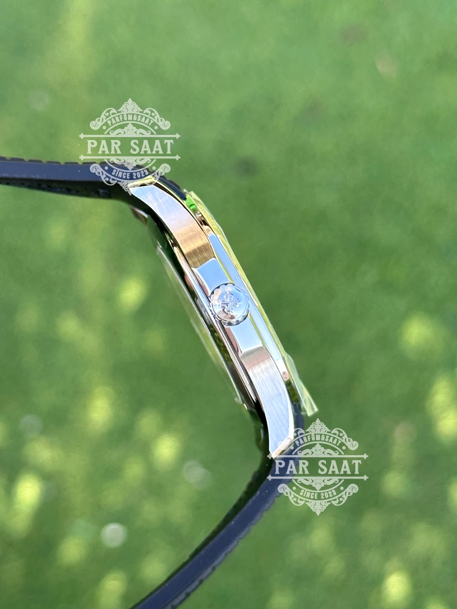 Patek Philippe 5167, Nautilus koleksiyonunun zarif ve sportif bir parçasıdır. 40 mm paslanmaz çelik kasa, Patek Philippe’in ünlü tasarımını zarif bir şekilde sunar. Fırçalanmış ve parlatılmış yüzeylerin mükemmel geçişleri, saatin hem şıklığını hem de dayanıklılığını simgeler. Kadrandaki sunburst tonları, ışıkla değişen canlı bir efekt yaratır ve saatin her açıdan farklı bir güzellik ortaya koymasına olanak tanır. Altın renkli indeksler, okuma kolaylığını artırırken, estetik açıdan saatin zarifliğini pekiştirir.