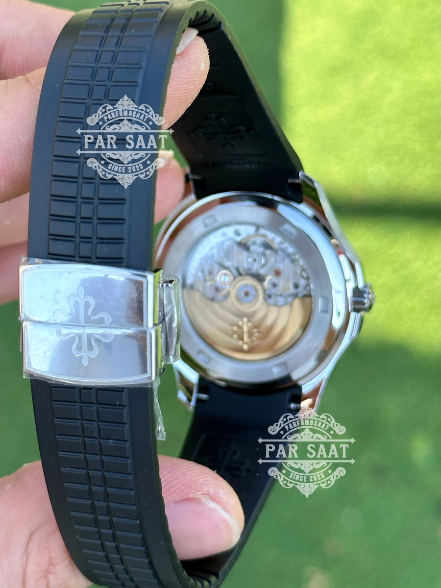 Patek Philippe 5167’nin kauçuk kayışı, saatin sportif tarzını vurgularken, bilekte rahat ve konforlu bir kullanım sağlar. Dayanıklı ve esnek yapısı, saatin her durumda mükemmel bir uyum sağlamasına olanak tanır.