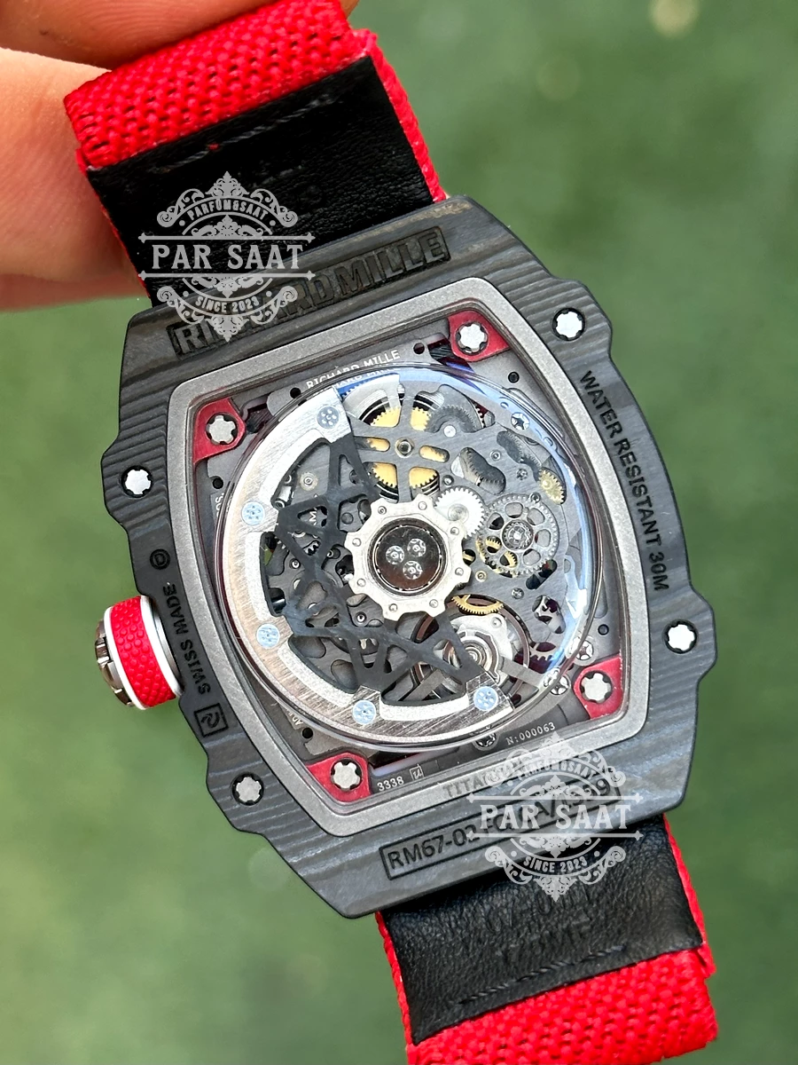 38.7 mm x 47.52 mm tono kasa, sporcu anatomisine uyum sağlayan patentli Velcro kayış ile kusursuz konfor sunarken ve şok absorbe eden tasarımıyla günlük hayatın dinamizmine meydan okuyor.  Her bilekte bir sanat eseri: RM67-02, lüks ve teknolojinin süblime bir manifestosu.