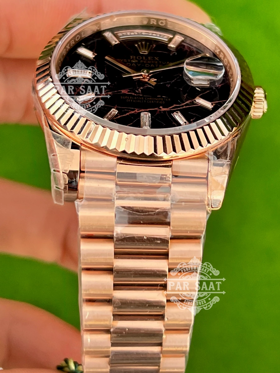 - Tasarım: Day-Date, zarif bir tasarıma sahip olup genellikle 18 ayar altın veya beyaz altın kasa ile üretilir. Kasa genellikle 36 mm veya 40 mm boyutlarındadır. Saatin kadranı, farklı renk seçenekleri ve yüzey kaplamalarıyla sunulur.