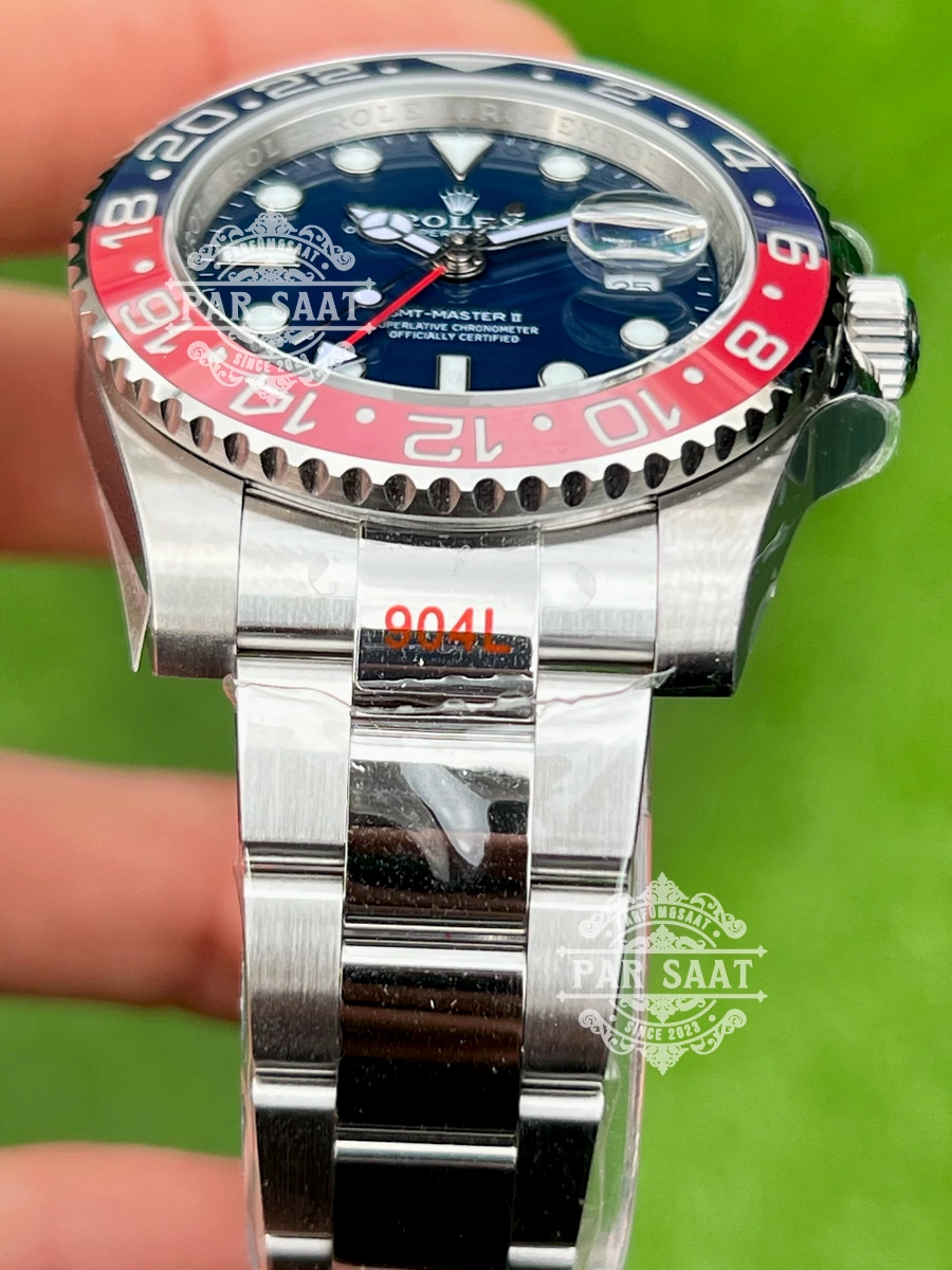 Kasa ve Boyut: GMT Master II, genellikle 40 mm çapında yuvarlak bir kasa ile gelir. Kasa, 904L paslanmaz çelik, altın veya Rolesor malzemelerinden üretilmektedir. Bu malzemeler, hem dayanıklılığı hem de estetik görünümü ile dikkat çeker.