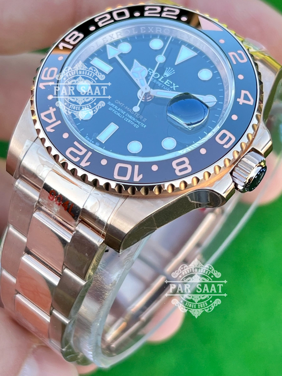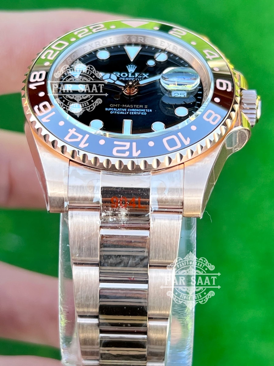 Kasa ve Boyut: GMT Master II, genellikle 40 mm çapında yuvarlak bir kasa ile gelir. Kasa, 904L paslanmaz çelik, altın veya Rolesor malzemelerinden üretilmektedir. Bu malzemeler, hem dayanıklılığı hem de estetik görünümü ile dikkat çeker.